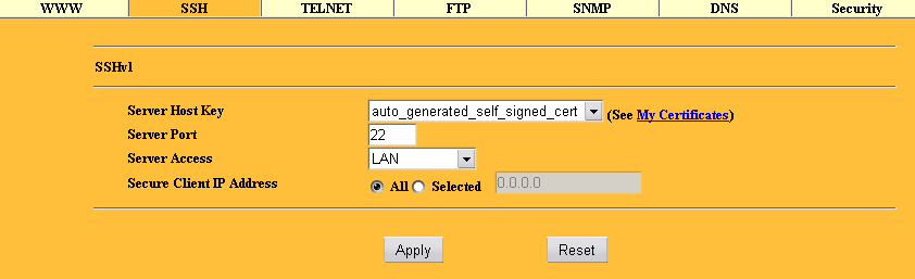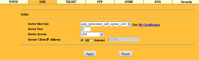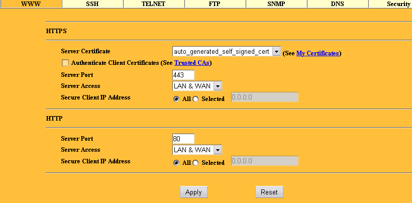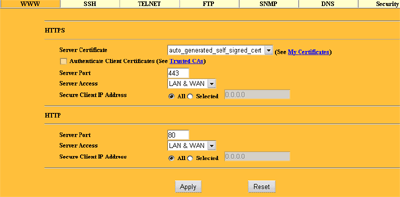 В Remote MGNT можно настроить, какие именно типы удаленного управления разрешить. Для каждого сервиса можно указать свой порт, привязать его к LAN и/или WAN интерфейсам, и даже к конкретному IP адресу (последнее означает, что только с этого IP можно будет управлять устройством).При настройке HTTPS или SSH доступа, требуется указать еще и сертификат, используемый при шифровании трафика.
