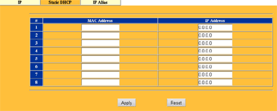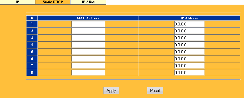 Тут же настраивается привязка MAC адресов к IP для DHCP сервера. Странно, что количество привязок ограничено всего лишь восьмью.