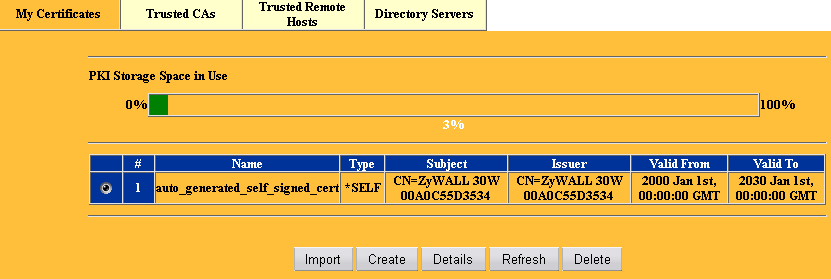 Следующий раздел Certificates. Он служит для управления сертификатами, как локальными, так и с внешних источников. Сертификаты необходимы для работы протоколов шифрования, используемых на ZyWALL, т.е. для HTTPS, SSH, IPSec.