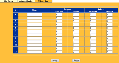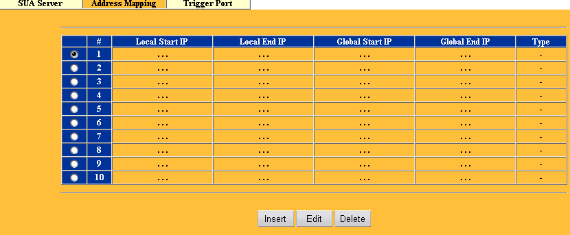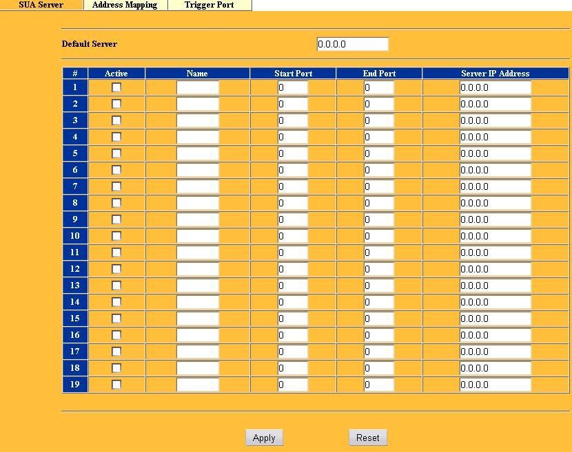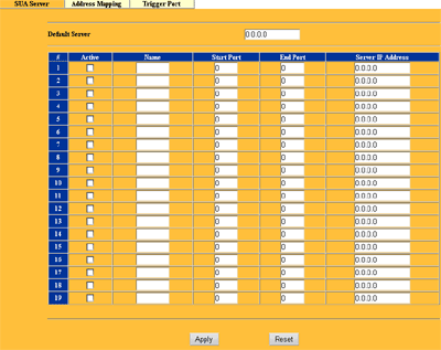 Следующий раздел SUA/NAT посвящен настройкам NAT механизмов. В первой закладке настраивается редирект групп или отдельных портов внутрь локальной сети.