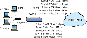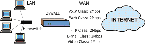 Кроме всего вышеперечисленного, ZyWALL 30W позволяет создавать классы QoS (качества обслуживания), т.е. основной канал делится на подканалы и, в зависимости от описанных администратором правил, можно обеспечивать выделенным пользователям гарантированные полосы на определенные приложения, или ограничить трафик для определенных сервисов (например, не допустить забитие всего интернет-канала трафиком от FTP-сервера).
