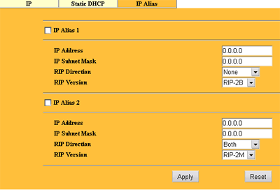 А в закладке IP Alias настраивается 2 дополнительных адреса (IP Aliases) для интерфейса локальной сети. Это позволит на одном физическом LAN интерфейсе иметь три логических IP адреса, правда все три будут обладать одним и тем же MAC адресом.