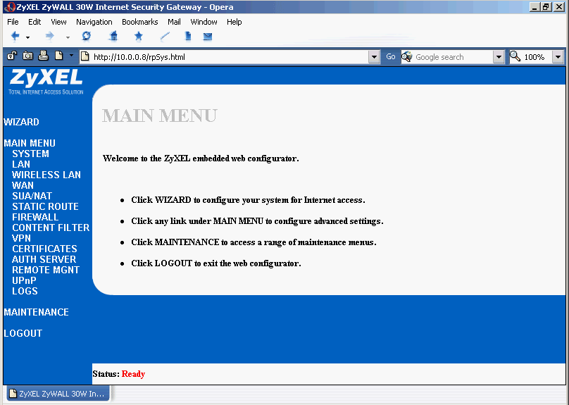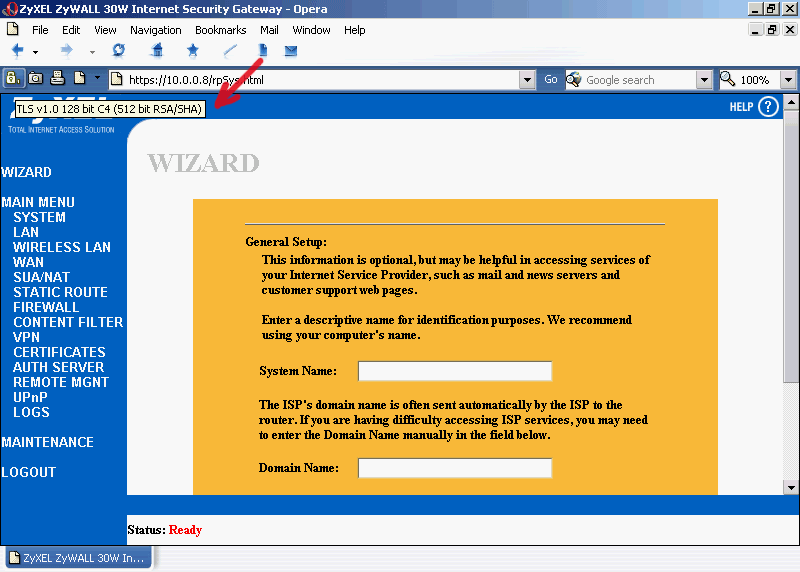 HTTPS интерфейс от предыдущего отличается только наличием шифрования между клиентом и WEB-интерфейсом устройства. Это большой плюс, так шифрованная сессия защищает трафик (манипуляцию с настройками ZyWALL) от перехвата. Можно пройтись по каждому пункту меню (чем мы и займемся чуть ниже), настроив все что угодно под свои нужды или воспользоваться визардом настроек. Последний позволяет быстро сконфигурировать основные функции устройства даже человеку, не сильно знакомому с подобным процессом. Причем визард исключает ситуацию, когда возможен пропуск какого-то важного пункта при ручной настройке ZyWALL.