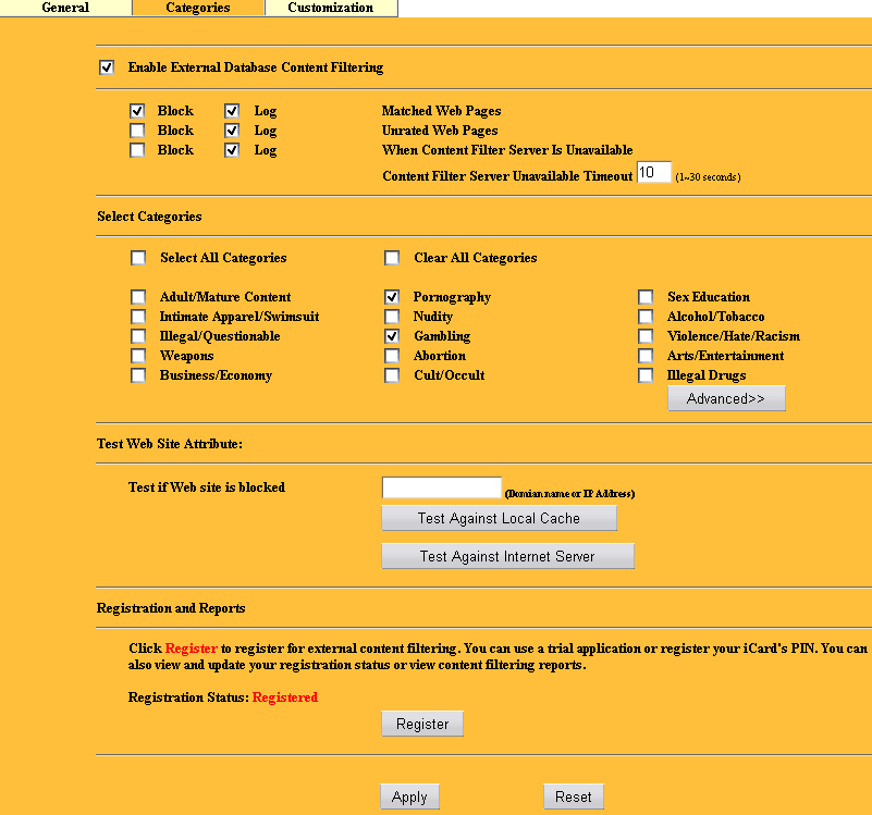 В следующей закладке настраивается, какие именно категории сайтов блокировать. Рейтинг сайтов берется из внешней базы данных (компания Cerberian), пользование которой бесплатно первый месяц, а дальше придется платить. По результатам исследования компании ZyXEL 80% Российский сайтов в этой базе данных рейтингованы. Полагаю, это верно в первую очередь для крупных сайтов и никоим образом не касается небольших сайтов, расположенных на бесплатных хостингах. Тем не менее, данную функцию (совместно с добавленными вручную URL-ами) вполне можно использовать.