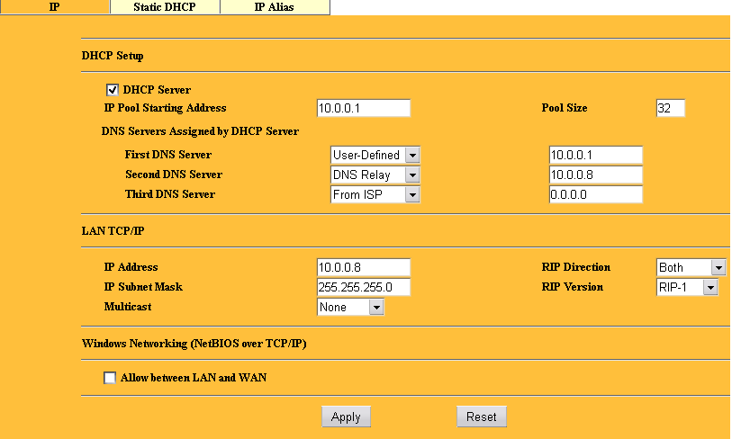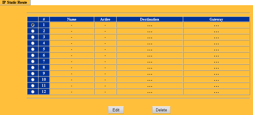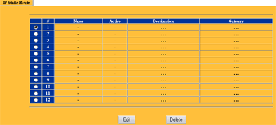 Раздел Static Route позволяет манипулировать со статической таблицей маршрутов. Возможно указание до 12 маршрутов, в каждом из можно указать метрику, а так же скрыть этот маршрут, т.е. не светить его в RIP записях.