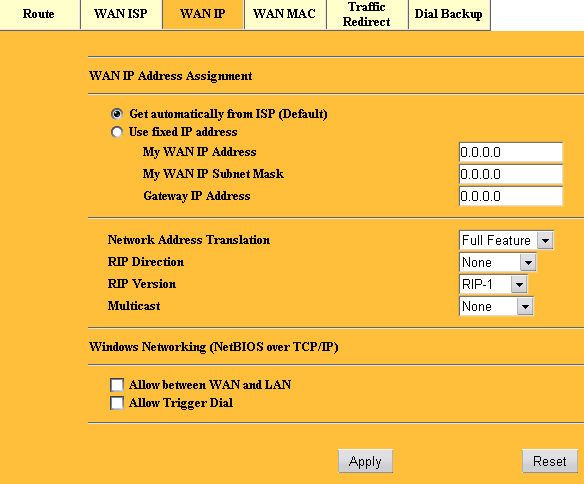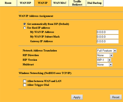 Маршрутизатор также обладает полноценным NAT с поддержкой создания новых соединений, инициированных извне (из WAN) на основе Stateful Inspection. Подобный механизм позволяет работать сервисам, требующим открытия дополнительного канала от сервера к клиенту, к примеру Microsoft Netmeeting, ICQ file transfer, etc.
