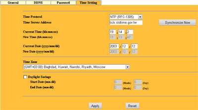 В закладке Time Settings возможна ручная установка времени (включая временную зону и (!) учет перехода на зимнее время) или синхронизация времени с серверами точного времени в Интернет.