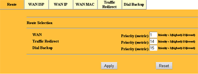 В закладке Route описываются приоритеты интерфейсов (маршрутов) трафика для WAN интерфейса, редиректа трафика на другой хост и Dial-интерфейса (модема).