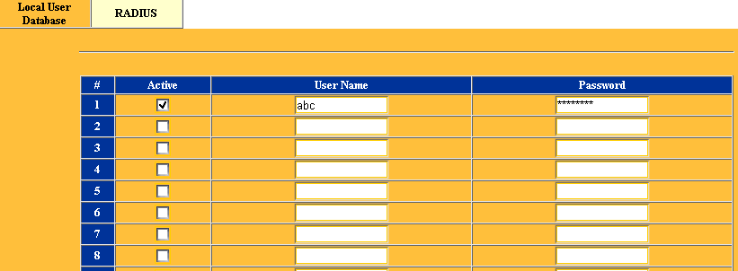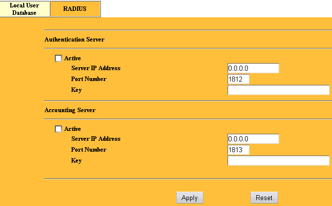 Настройка серверов аутентификации вынесена в отдельный раздел AUTH SERVER. Аутентификация пользователей может проходить как на локальной (размещенном на ZyWALL) базе пользователей (до 32 записей), так и посредством внешнего Radius сервера.