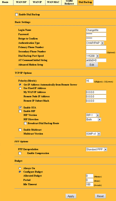 На закладке Dial Backup так же настраивается параметры запасного канала, но в качестве последнего выступает модем (подключенный к com-порту). Тут указываются все специфические для модемного Интернет настройки, в том числе максимальное время работы модема в день, период суток, когда можно использовать этот запасной канал.