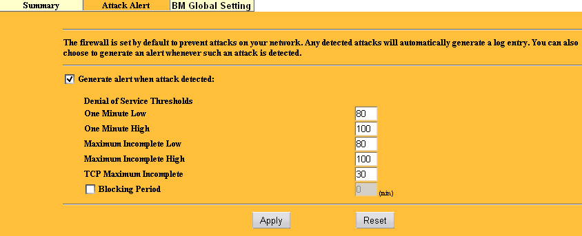 В закладке Attack Alert настраиваются коэффициенты срабатывания детектора атак, по которым срабатывает правило блокировки атакующего хоста. Блокировка может быть как постоянной, так и временной.