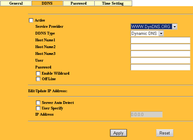 В закладке System ничего необычного, в следующей DDNS возможна настройка сервера динамического DNS (в данном случае возможно лишь использование службы DynDNS.org). Напомню, что динамический DNS позволяет работать в Интернет по фиксированному доменному имени даже пользователям, не имеющих статического IP адреса. При выходе в сеть система сообщает DynDNS свой новый динамический IP адрес и служба DynDNS обновляет привязку IP адреса к домену пользователя.