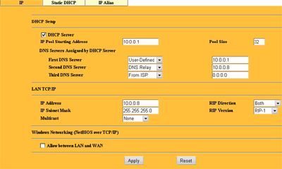 В раздел LAN возможна настройка IP-адресации на этом интерфейсе, включение DHCP сервера и протокола динамической маршрутизации RIP.