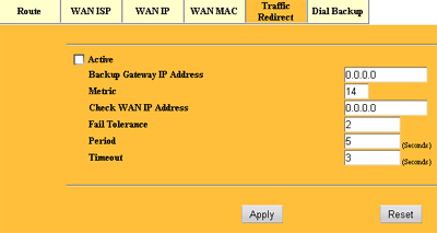 Закладка Traffic Redirect позволяет указать шлюз, куда будет развернут весь трафик при падении основного канала в Интернет через WAN интерфейс. Тут же настраиваются специфические параметры, позволяющие мониторить WAN интерфейс и определять факт падения канала.