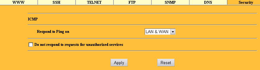 В последней закладке этого раздела Security можно выборочно запретить ответы на ICMP Echo Request, а так же отключить ICMP ответы для закрытых и неиспользуемых портов.