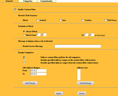 Раздел Content Filtering позволяет настроить фильтрацию web-контента, а так же активировать блокировку таких web-компонентов, как Cookies, Java, ActiveX, Web Proxy. Причем этом может быть как постоянная блокировка, так и активная лишь в определенный период времени. Тут же настраивается список компьютеров к которым применять вышеописанные правила (или исключить их из правил блокировки).