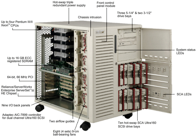 - процессор — от одного Pentium III Xeon 500 MHz до четырех на частоте 700 MHz