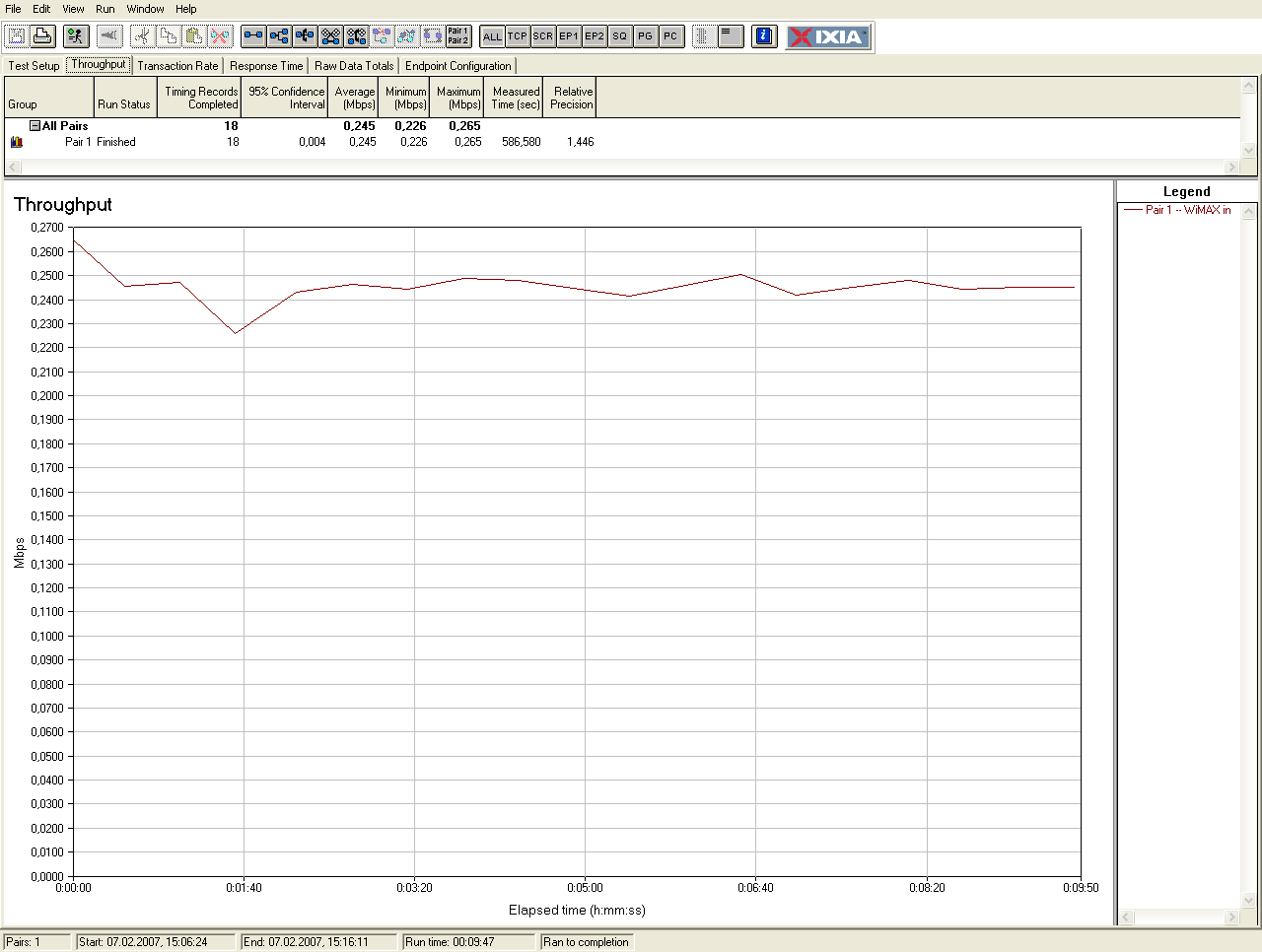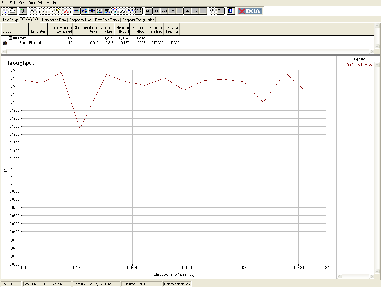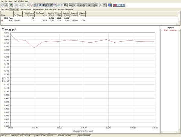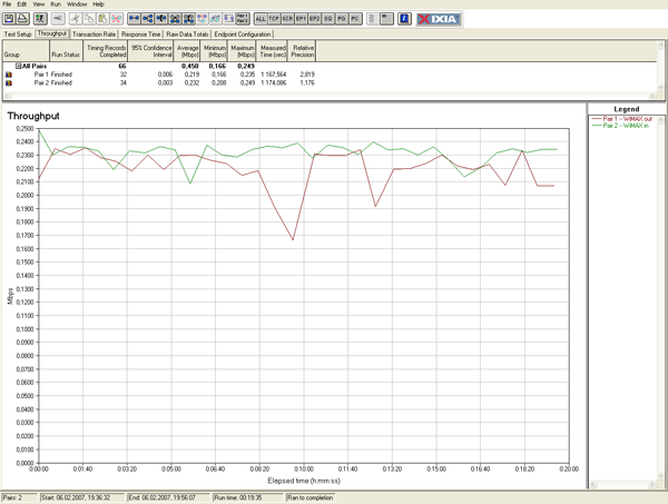 Чтобы померить скорость, было решено использовать стандартный тест NetIQ, гоняя трафик между своим домашним компьютером и компьютером, подключенным к сети Интернет через сеть «Synterra WiMAX». Естественно, объективным такой тест назвать нельзя, так как трафик гоняется через неподконтрольные нам сети. Домашнее подключение — 2048/2048 кбит/с с внешним IP-адресом, что существенно больше, чем максимальная скорость, которую можно получить с использованием «WiMAX от Синтерры» (1,3 Мбит/с). Тестирование производилось с использованием подключения на скорости 256 кбит/с.