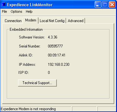 Судя по названию, назначение утилиты заключается в определении качества поступающего сигнала. Данная утилита и помогла определить IP-адрес беспроводного модема и попасть в WEB-интерфейс. Тем не менее, программа почему-то не отображает качество сигнала — об этом свидетельствует нижняя строчка на скриншоте выше (Expedience Modem is not responding). Получается, что программа видит устройство, определяет его IP-адрес, серийный номер и др., но не обменивается с ним никакими другими данными.