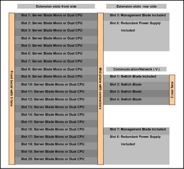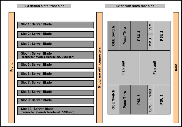 Как и в BX300, все устройства допускают горячую замену. Блок-схему шасси можно посмотреть на этой иллюстрации. Дополнительно можно установить блок с внешними разъемами SCSI (два разъема HD68, прямое подключение к SCSI-контроллерам двух «лезвий»), в два дополнительных коммуникационных отсека два сквозных модуля Fibre Channel, два сквозных сетевых модуля или два гигабитных коммутатора.