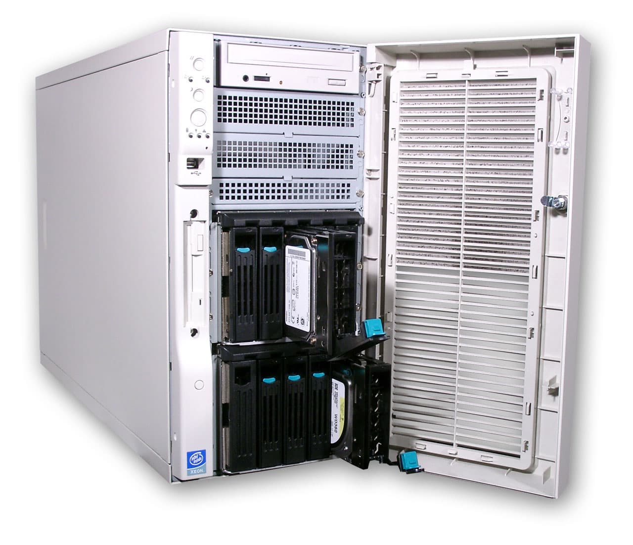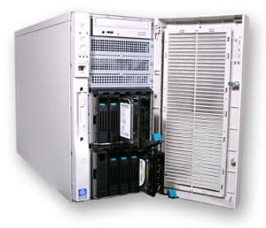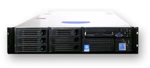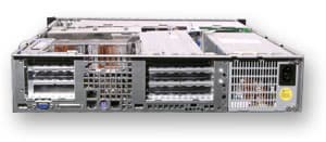 На переднюю панель выводится три 5-дюймовых отсека, USB и дисковод, а так же две дисковые корзины. Первая корзина позволяет установить до пяти жестких дисков с интерфейсом U320SCSI, а вторая до четырех дисков с интерфейсом SATA. Отметим, что в сервере возможны различные варианты дисковой подсистемы.