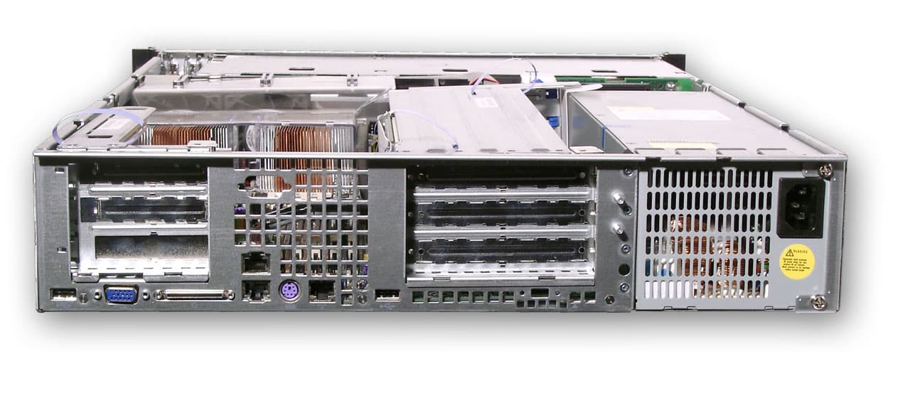 Бросив взгляд на заднюю стенку корпуса, сразу обращаем внимание на отсутствие стандартного (DB-9) COM-порта, вместо этого он разведен на RJ-45. Под разъем DB-9 на корпусе ппредусмотрена планка, но что бы его использовать, необходимо при сборке сервера заказывать дополнительный Kit (при его отсутствии, могут возникнуть трудности с подключением управляющего кабеля к UPS или подобному устройству).