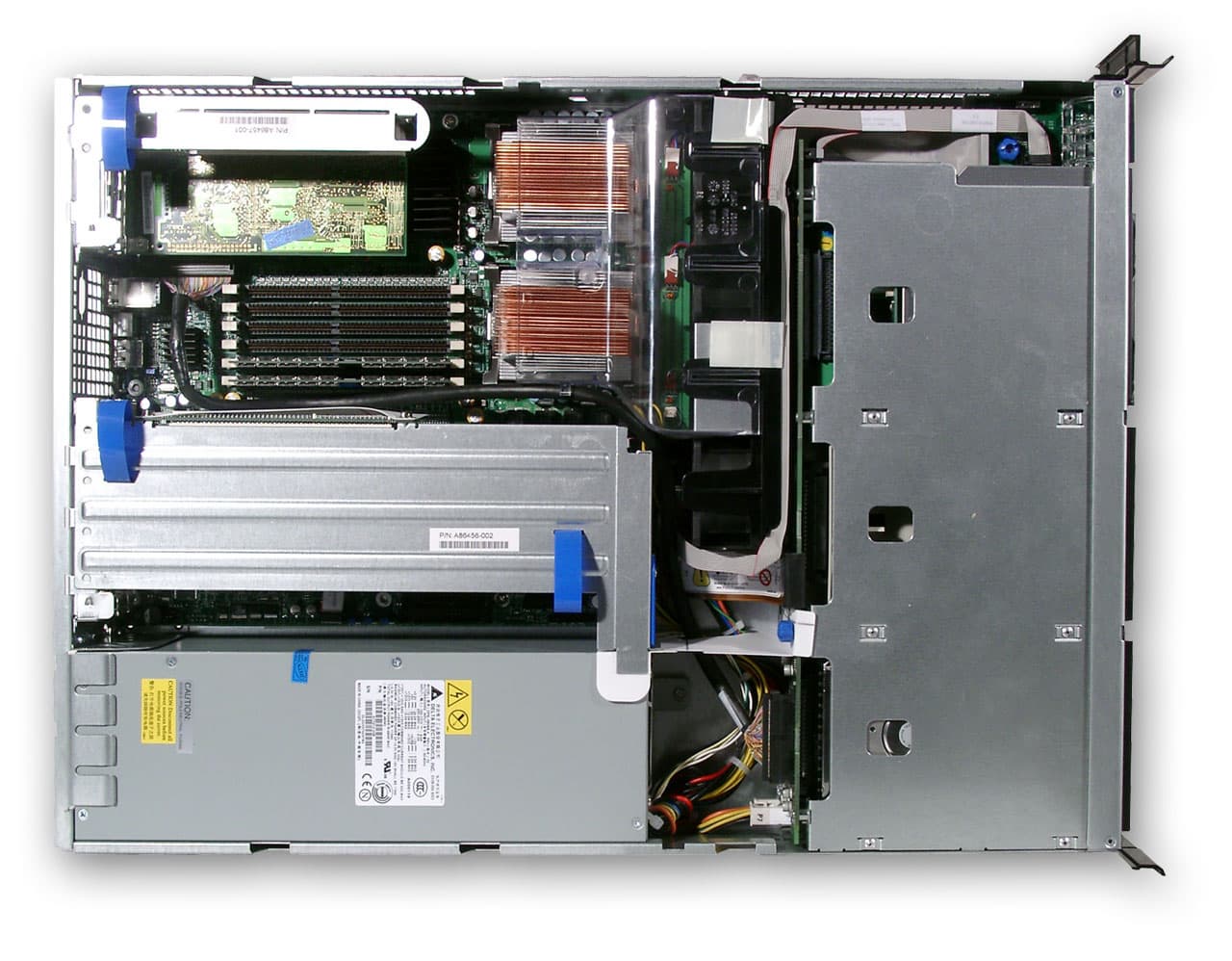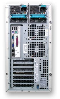 Особого внимания заслуживают два блока питания, работающих в режиме резервирования — при отказе одного автоматически подключается второй, а так же позволяющие заменять любой из них на лету, не выключая сервер. Боковая стенка корпуса крепится на двух крепежных болтах, закручивающихся вручную, что снижает время доступа к компонентам и уменьшает время простоя сервера.