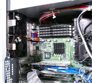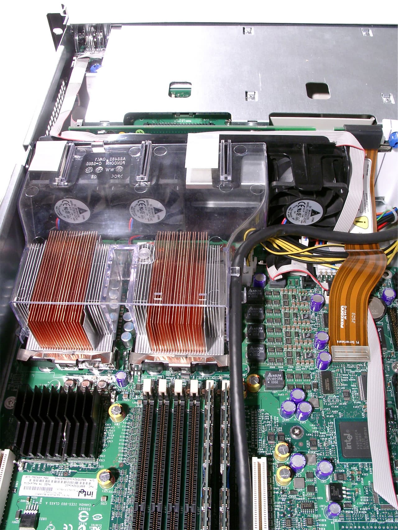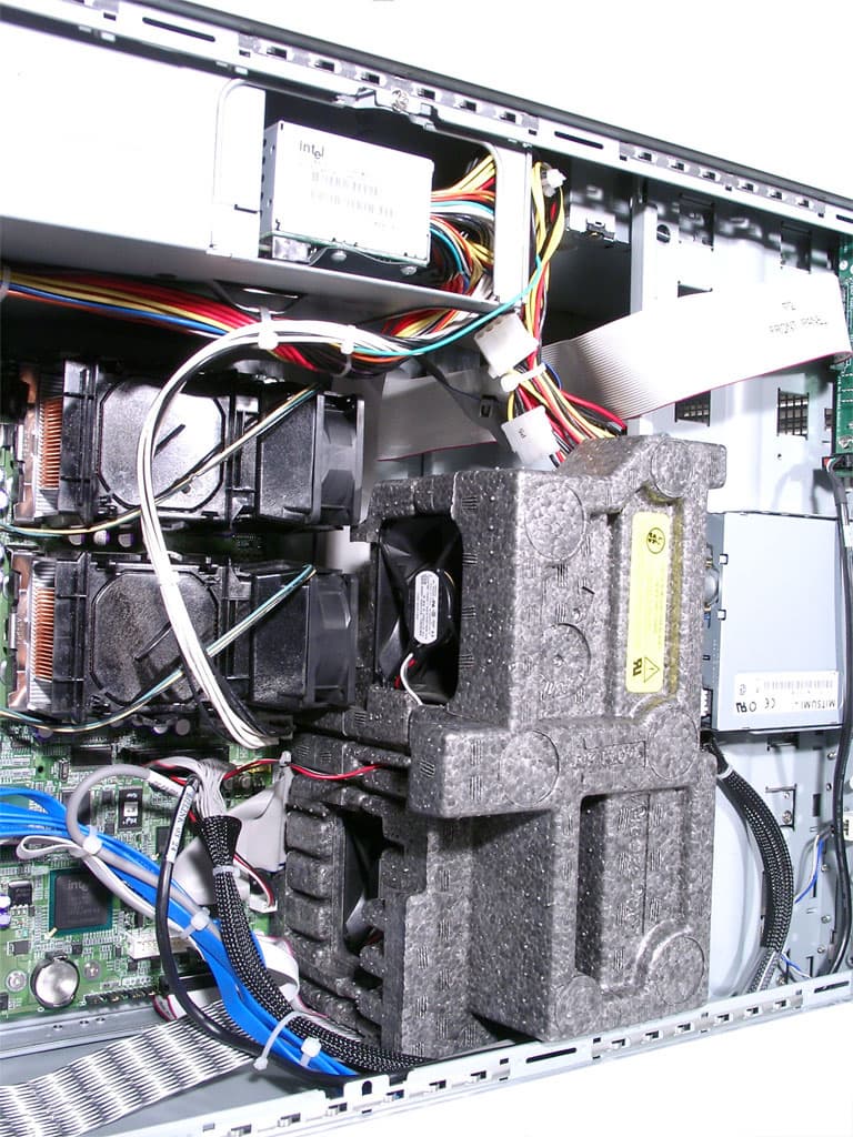 Первые два кулера расположены непосредственно на радиаторах процессоров и осуществляют охлаждение последних. Следующие два в глубине оригинальной сборной конструкции из пластикового материала (напоминающего пенопласт). Эти вентиляторы гонят воздух сквозь дисковые корзины, тем самым охлаждая в них hostwap-диски. Отмечу, что все кулеры не являются hotswap-выми.