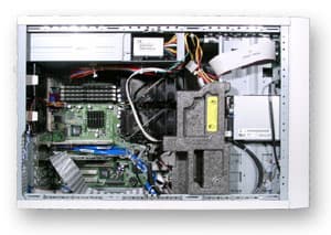Упаковка корпуса довольно плотная. Сверху видны две riser-карты, посредством которых можно подключить до 6 карт к двум независимым PCI-шинам. В корпусе находятся три не-hotswap кулера.