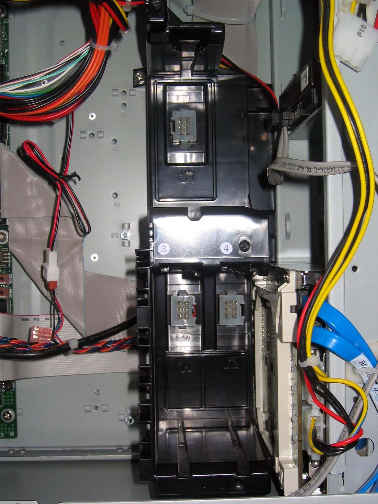 Так как в нашей конфигурации нет scsi-дисков, то мы её выкрутили. После недолгого раздумья и внешнего осмотра зародилась одна мысль. Надо сказать, что основа у обеих корзин одинаковая, различаются они только печатной платой находящейся на дне корзины. К корзине прикручены широкие салазки для крепления в корпусе, вот они-то и дали толчок мысли.