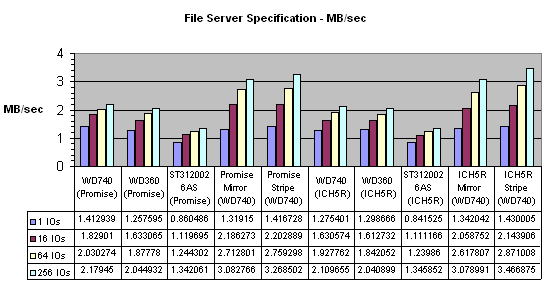 То есть в случае с отдельными дисками Promise даёт ровную производительность при любом размере блока. ICH5R набирает обороты только на 8-32 кб в зависимости от диска.