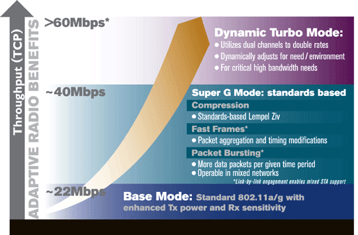 В базовом режиме 802.11g или 802.11a, в котором все расширенные технологии отключены, можно получить скорость до 22 Мбит (чистых, т.е. доступных пользователю). Добавляя технологии, которые возможно будут в будущем стандарте 802.11e (Bursting, Fast Frames, Compression), можно увеличить скорость до 40 Мбит включительно. Активируя Dynamic Turbo режим, т.е. задействуя два канала под передачу данных, можно довести скорость до теоретического максимума в 60 Мбит.