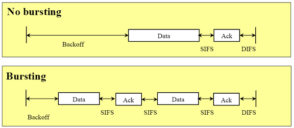 К примеру, в беспроводной сети две станции, одна расположена близко к точке доступа, другая удалена от нее. Разумеется, дальний клиент работает с точкой доступа на более низкой скорости (из-за расстояния). Поэтому для передачи данных определенного размера (для ближайшего клиента) ему потребуется больше времени, чем ближайшему — для приема этих данных. В этом случае активация bursting для дальней станции позволит ей сократить время передачи порции данных и, как ни странно, это же позволит ближайшей станции еще быстрее эти данные принять (так как она меньше будет ожидать на линии освобождения эфира). Интервалы, на которые клиенты могут занять эфир "burst"-передачей, также зависят от удаленности (точнее, скорости работы) клиентов. Ближайший клиент получит грант на более длинную burst-передачу, так как за единицу времени он передает больше данных (и быстрее освободит эфир).