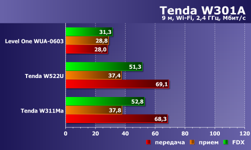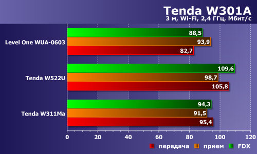 Во второй группе тестов мы проверим несколько адаптеров в нескольких точках квартиры. Будут использоваться модели на чипах Ralink, имеющие разные характеристики: Level One WUA-0603 — адаптер небольшого размера с поддержкой 150 Мбит/с, Tenda W522U — модель стандартного дизайна с поддержкой 300 Мбит/с, Tenda W311Ma — устройство с увеличенной антенной с поддержкой 150 Мбит/с. Из всего списка проверенных расположений мы оставили три наиболее характерных. Первая точка находится на прямой видимости от W301A, расстояние между устройствами составляет три метра. Вторая точка — пять метров и одна некапитальная стена. Третья — девять метров, две стены.