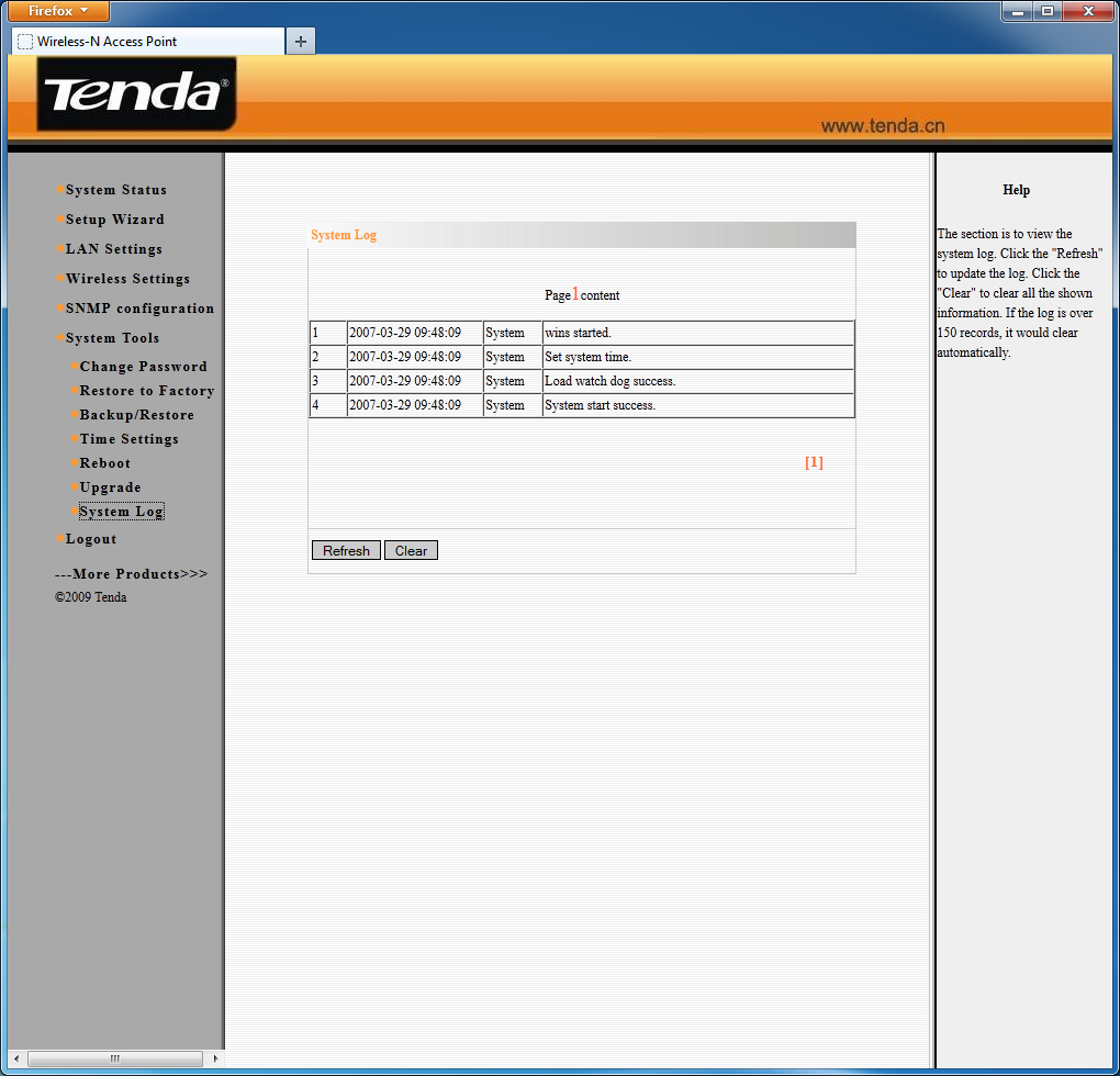 Системные опции традиционны для данного класса устройств — изменение пароля, обновление прошивки, работа с конфигурацией, настройка встроенных часов, перезагрузка, журнал системных событий. Последний сохраняется только в точке доступа и не отличается информативностью (так, в нем никак не отражаются подключение беспроводных клиентов).