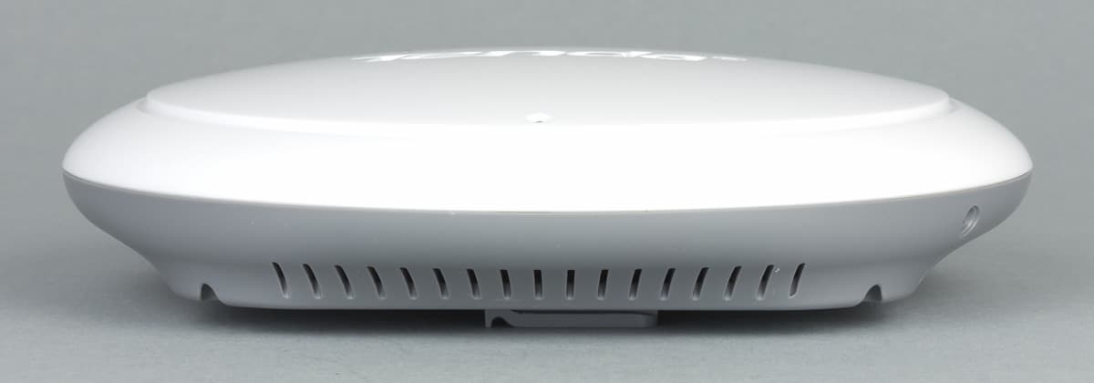Вторая часть корпуса из серого матового пластика имеет по периметру решетки вентиляции. На ней находится и отверстие для скрытой кнопки сброса. Диаметр модели составляет 14,4 см, а высота с учетом подставки — около 4 см. Обратим внимание на отсутствие кнопки WPS, но учитывая варианты установки точки доступа, это не является серьезным упущением.