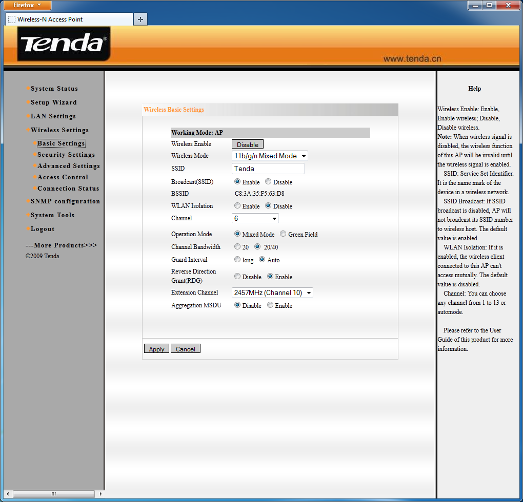 Больше всего страниц вполне ожидаемо посвящено опциям беспроводного контроллера. Основные включают в себя выбор режима работы (b, g, b/g, b/g/n), имени сети, включение изоляции беспроводных клиентов, выбор номера и ширины (20 или 20/40) канала. Точка доступа позволяет организовать открытую сеть или же защищенную с использованием WEP, WPA/WPA2 с паролем или с сервером RADIUS, 802.1X. Присутствует также страница с дополнительными опциями беспроводного соединения, но, к сожалению, документация не дает по ним полной информации.