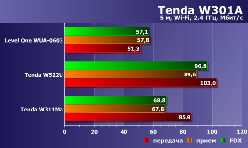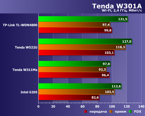 Первая группа тестов проводилась с адаптерами Intel 6205, Tenda W522U, TP-Link WNDA4800 и Tenda W311Ma. В ней мы оценим скорость работы беспроводного модуля точки доступа. Настройки точки доступа — режим WPA2-PSK AES. Расстояние между устройствами составляло около пяти метров, в эфире присутствовало несколько соседних сетей.