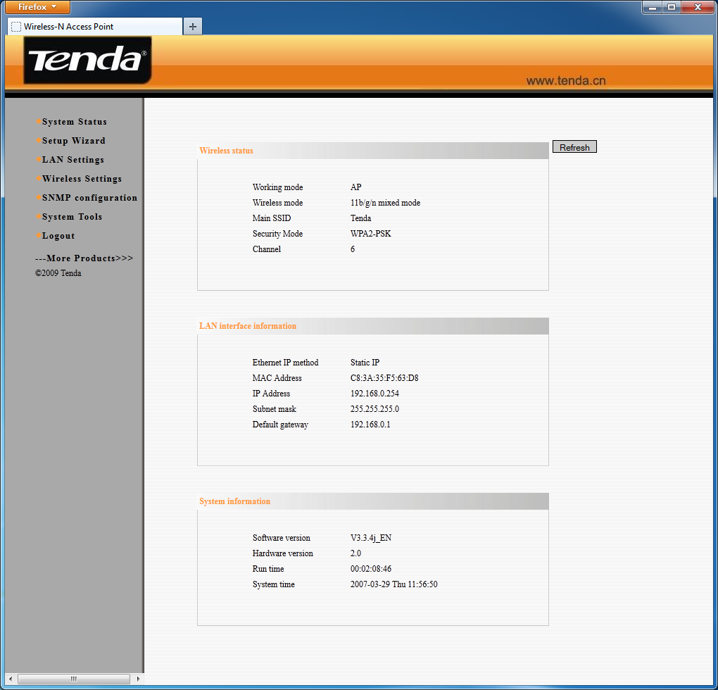 Точка доступа имеет предустановленный фиксированный адрес 192.168.0.254, так что для доступа к ее web-интерфейсу возможно придется изменить настройки сетевого адаптера в ПК. Отметим, что интерфейс есть только на английском языке. В тестировании использовалась последняя доступная версия прошивки V3.3.4j.