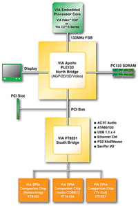 Вкратце повторюсь. Это безвентиляторное (с пассивным охлаждением) решение «все-в-одном». Плата собрана на чипсете VIA PLE133 (VT8601A), который обладает интегрированным графическим ядром AGP2x (на базе Trident Blade 3D), а так же южным мостом VT8231.
