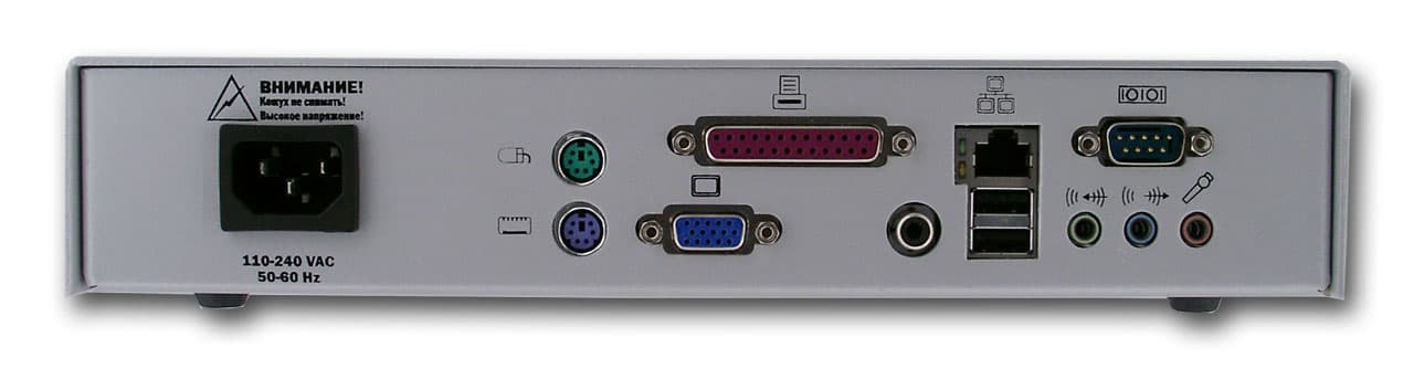 На материнской плате установлены стандартные внешние интерфейсы для подключение PS/2 клавиатуры и мыши, последовательный и параллельный порты, разъем видеокарты, сетевой 10/100 Мбит порт, а так же аудио-разъемы и USB. Отмечу, что в текущей версии прошивки тонкого клиента, к порту USB возможно подключения лишь HID (Human Interface Devices) устройств (таких, как клавиатура и мышь). Подключение USB принтеров пока невозможно в прошивке отсутствуют драйвера для них. Поддержка таких принтеров обещается в ближайших версиях прошивки. Подключение USB-дисков так же недоступно, до решения проблем с безопасностью. Так как при их подключении этой опции открываются довольно серьезные «дыры». То есть подобная операция возможна (в спец.версиях прошивки), но не рекомендуется к использованию. Это довольно логично, так как первоочередная задача предотвращение несанкционированного съема информации посредством того же flash-диска, подключаемого к порту USB.