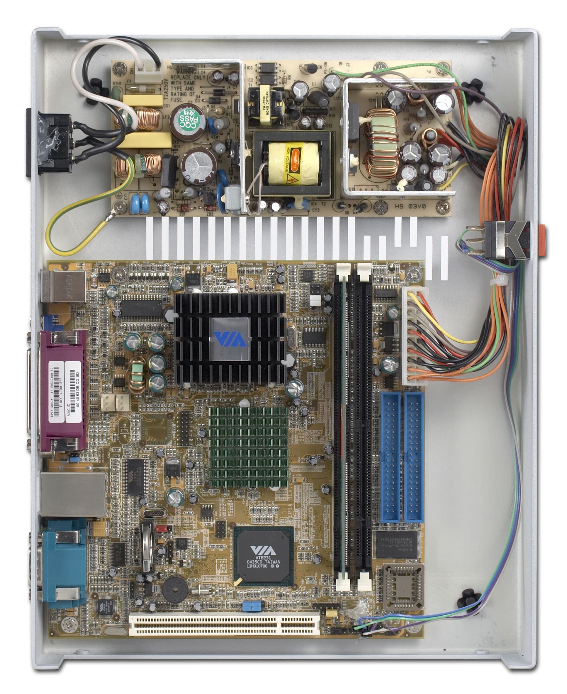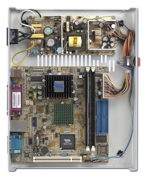 Все та же материнская плата VIA EPIA 5000 Mini-ITX, все тот же процессор VIA Eden ESP 5000 (частота 533 МГц), все тот же чипсет VIA PLE133 (северный мост VT8601 и южный мост VT8231). Встроенное видео AGP 2x Trident Blade 3D. Данной (на сегодняшний день устаревшей) конфигурации вполне хватает для решения задч, поставленных перед терминалом, ведь терминал только оттображает то, что происходит на удаленном сервере. При этом расходуются ресурсы того же удаленного сервера.