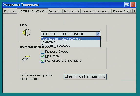 Здесь устанавливаются параметры воспроизведения звука, а также параметры локальных устройства. Можно сделать так, чтобы устройства, подключенные к портам терминала, могли быть доступны на сервере.