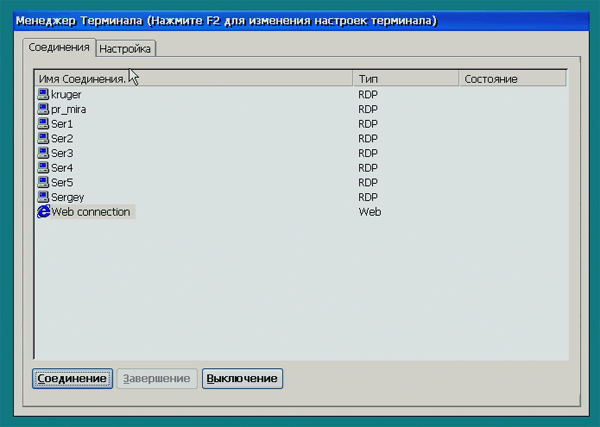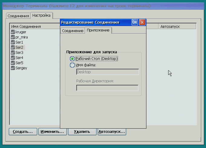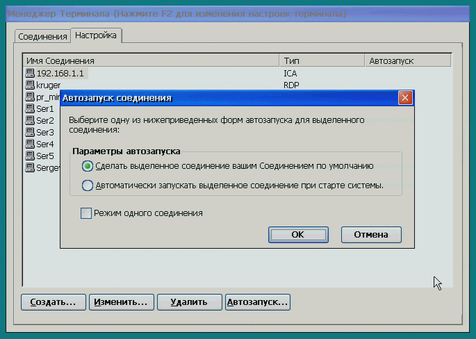 Здесь можно выбрать соединение, которое будет устанавливаться сразу после включения терминала