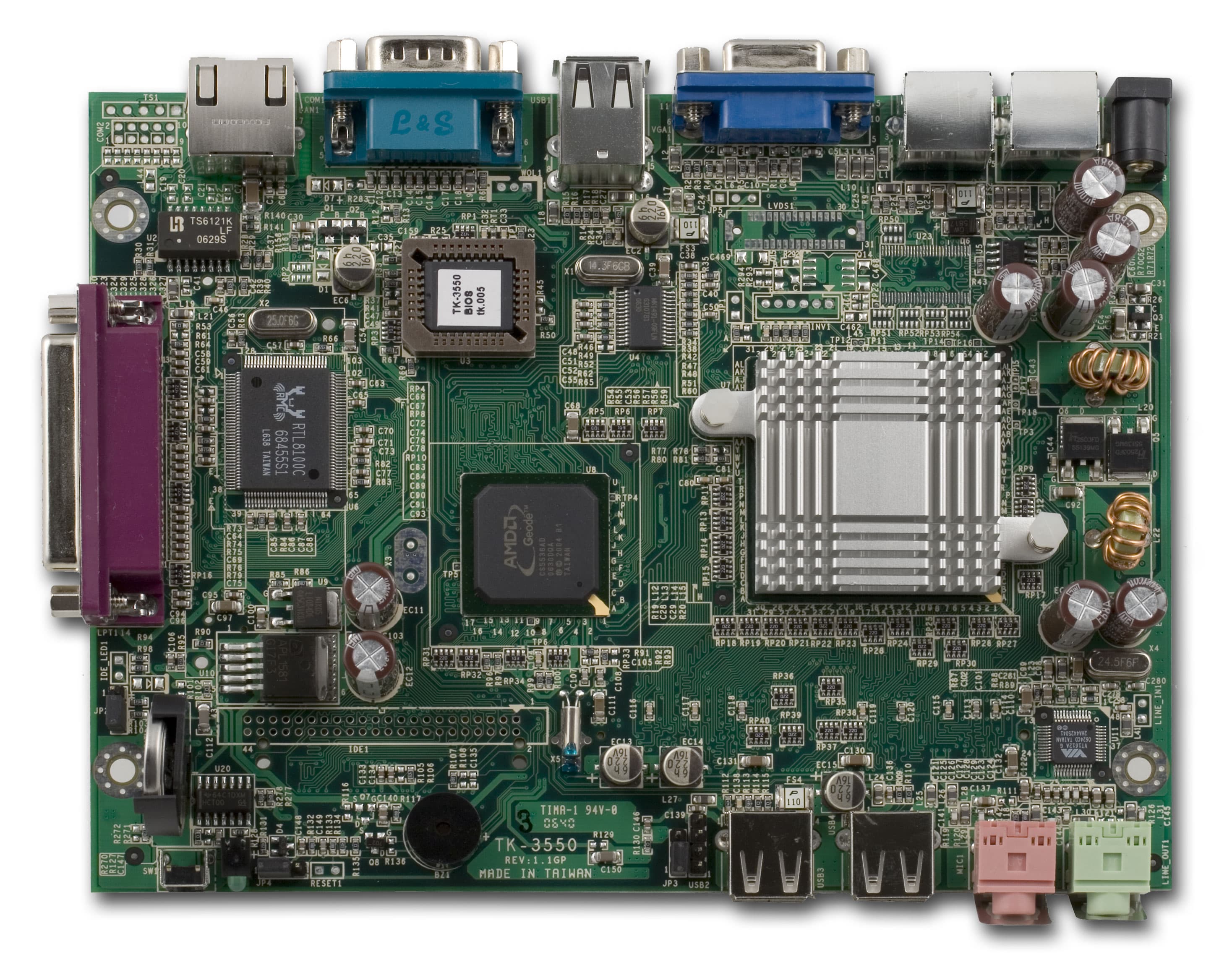 Встроенный сетевой адаптер выполнен на базе чипа Realtek RTL8100C (PCI/mini-PCI — интерфейс). На материнской плате стоит чипсет AMD CS5536, предназначенный для работы с процессорами AMD GX- и LX-серий. Сам процессор скрыт под радиатором, который помимо того, что прикреплен к плате штифтами, приклеен к самому процессору термоклеем, поэтому точную модель процессора выяснить не удалось (слишком велика вероятность повреждения самого чипа).