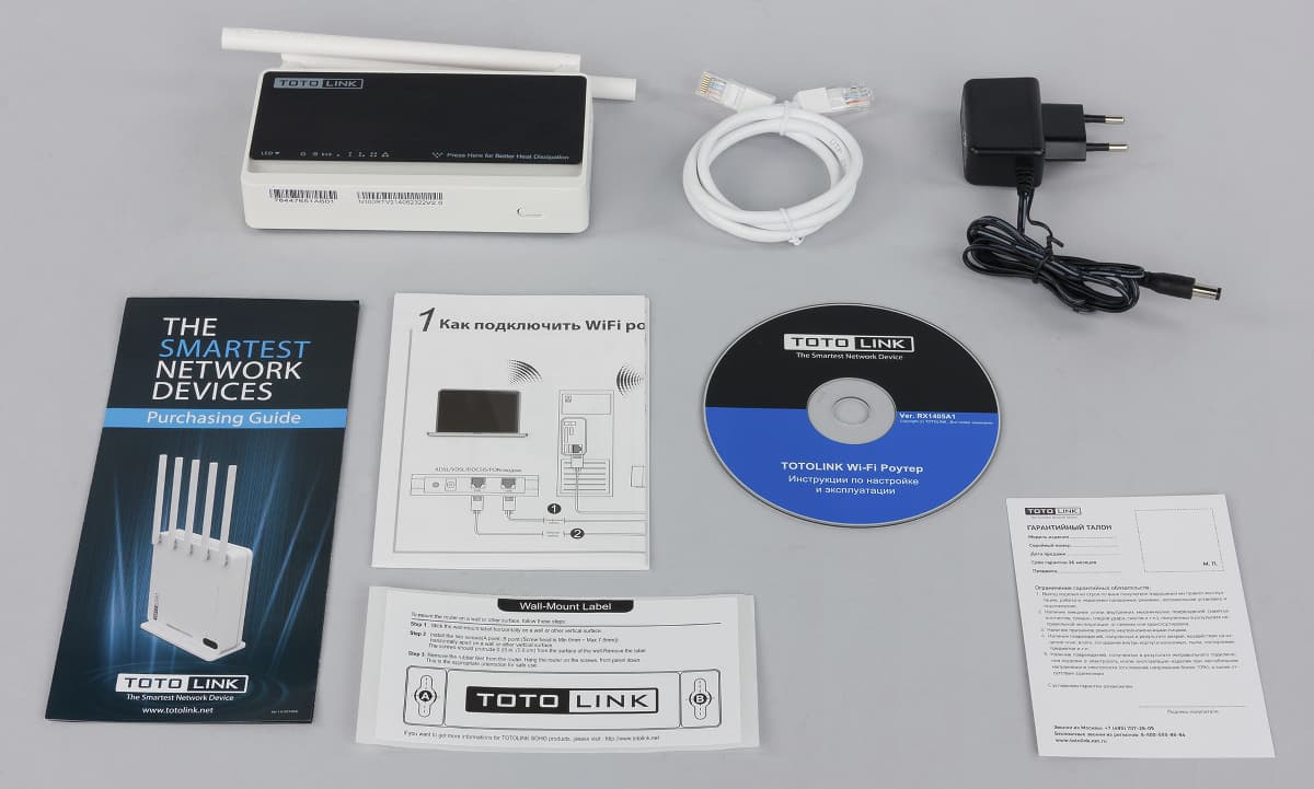 Внутри, в специальном лотке, находятся маршрутизатор, компактный импульсный блок питания 9 В 0,5 А, сетевой патч-корд, гарантийный талон, наклейка для разметки настенного крепления, краткая инструкция по установке на русском языке, компакт диск с электронной версией руководства пользователя на русском языке, а также каталог продуктов компании на английском языке.
