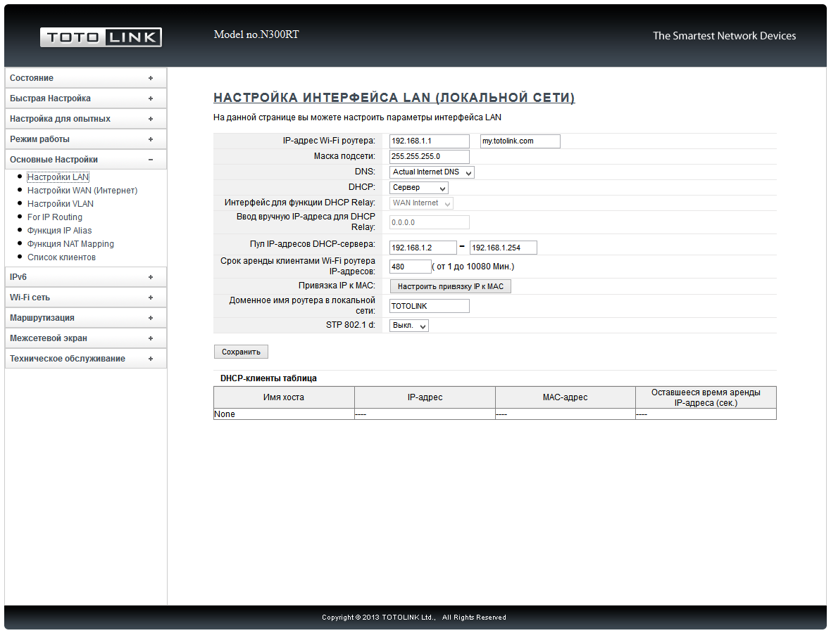 В настройках локальной сети можно изменить собственный адрес маршрутизатора, добавить дополнительные IP адреса для внутреннего интерфейса, настроить сервер DHCP (включая назначение постоянных адресов клиентам, но придется вписывать требуемые данные самостоятельно, а не выбирать из списка).