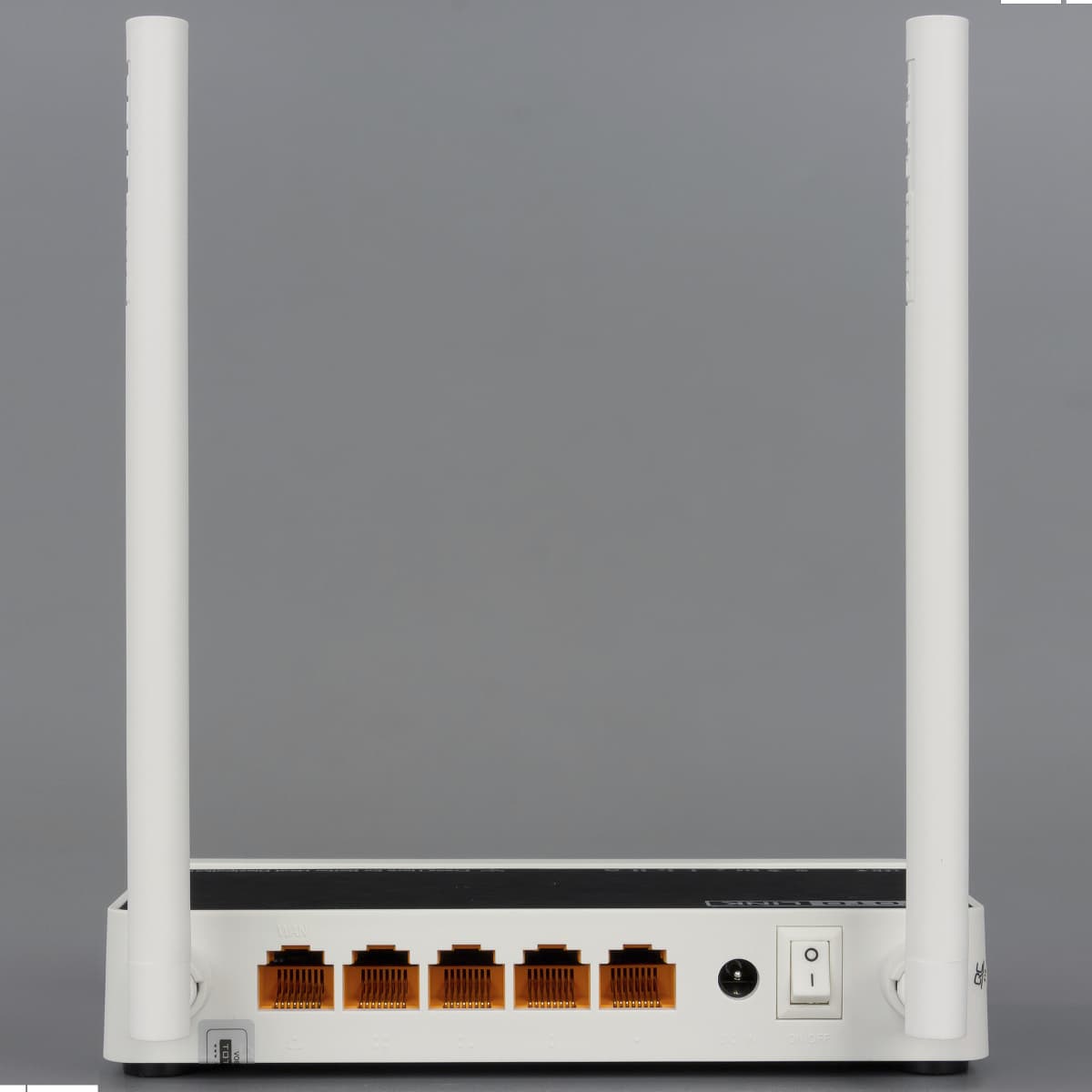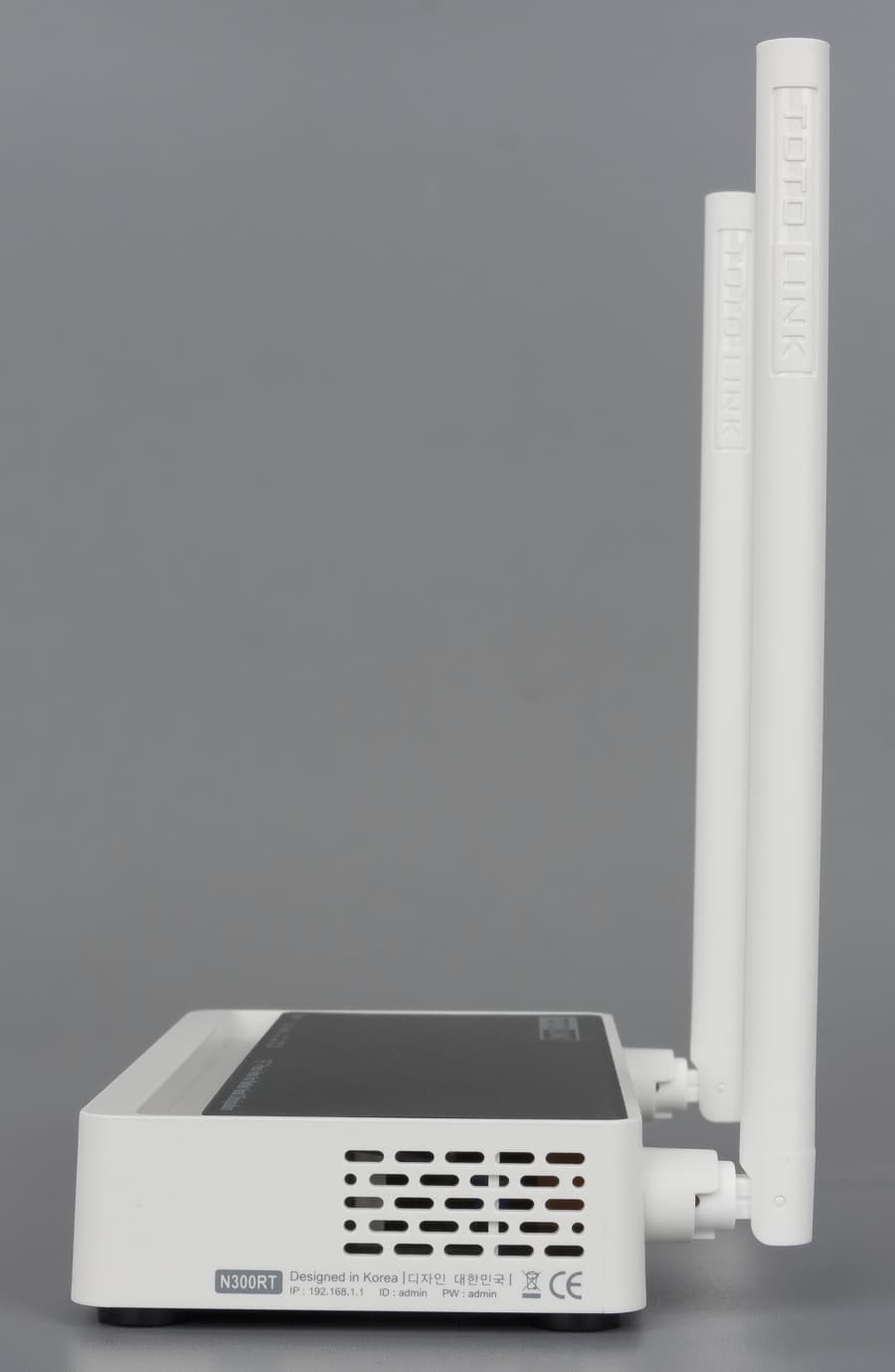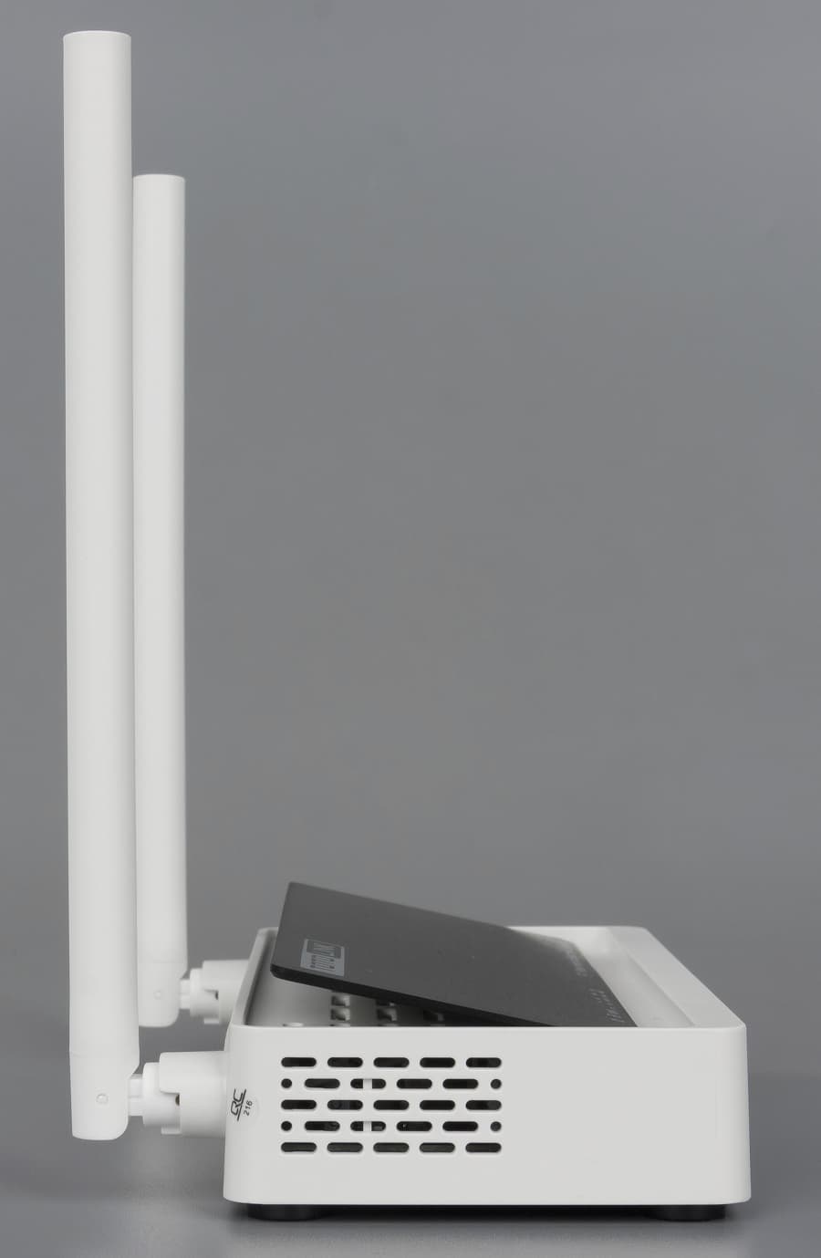 На боковых торцах находятся решетки вентиляции. Сзади установлены две несъемные антенны, пять сетевых портов 100 Мбит/с (1×WAN и 4×LAN), вход блока питания и аппаратный выключатель.