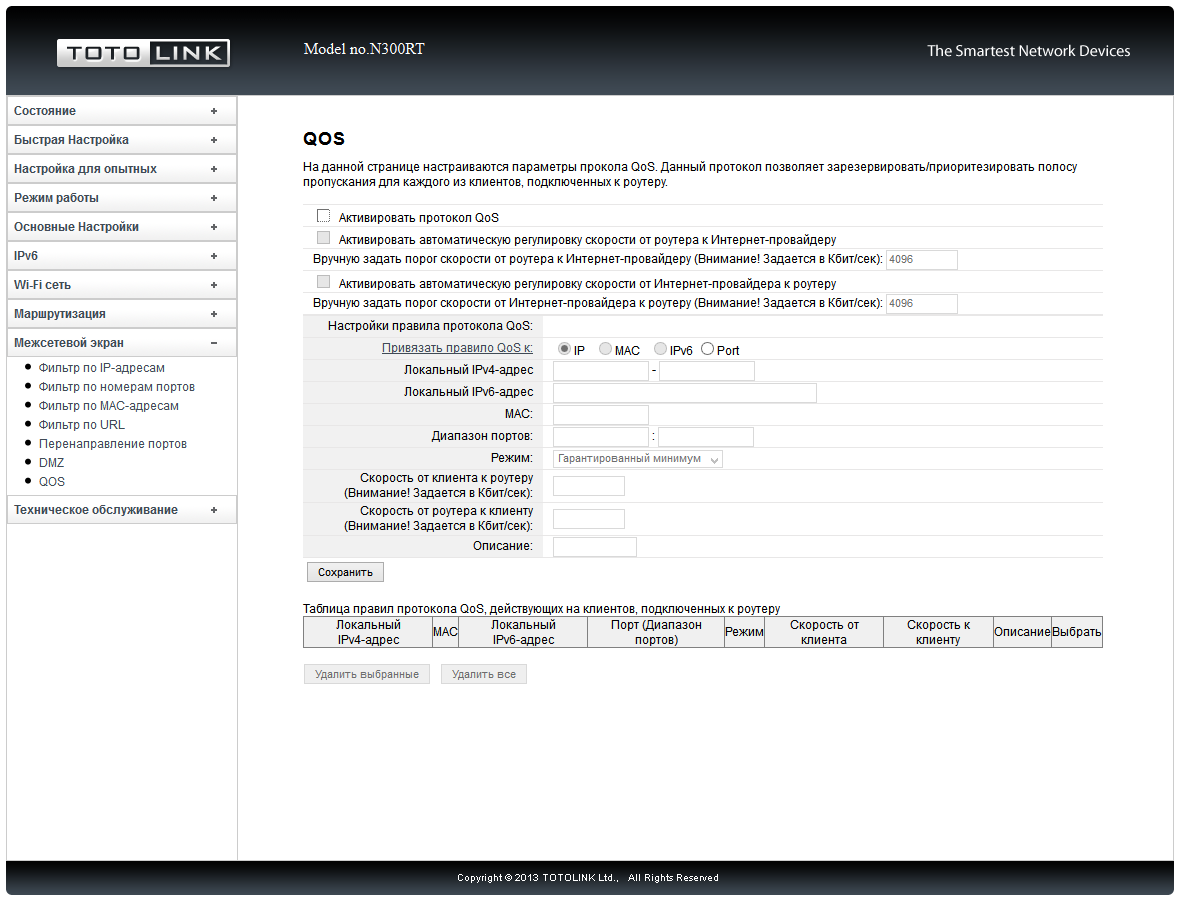 Устройство имеет поддержку регулировки полосы пропускания (QoS). В правилах для фильтрации трафика используются IP и MAC-адреса клиентов или номера портов. В каждом правиле можно указать ограничения (сверху или снизу) на скорость приема и передачи данных. Несмотря на то, что сервис создает высокую нагрузку на процессор роутера, в некоторых ситуациях он может оказаться полезным.