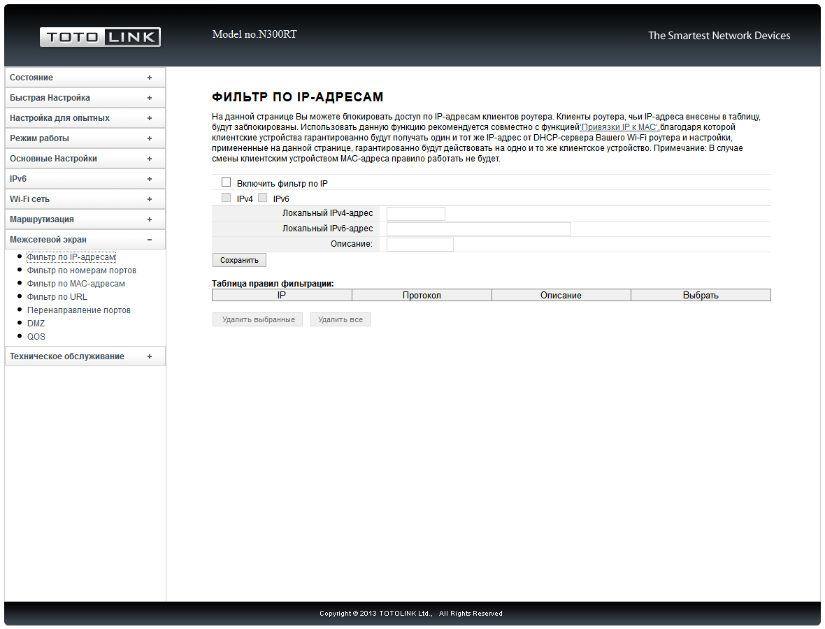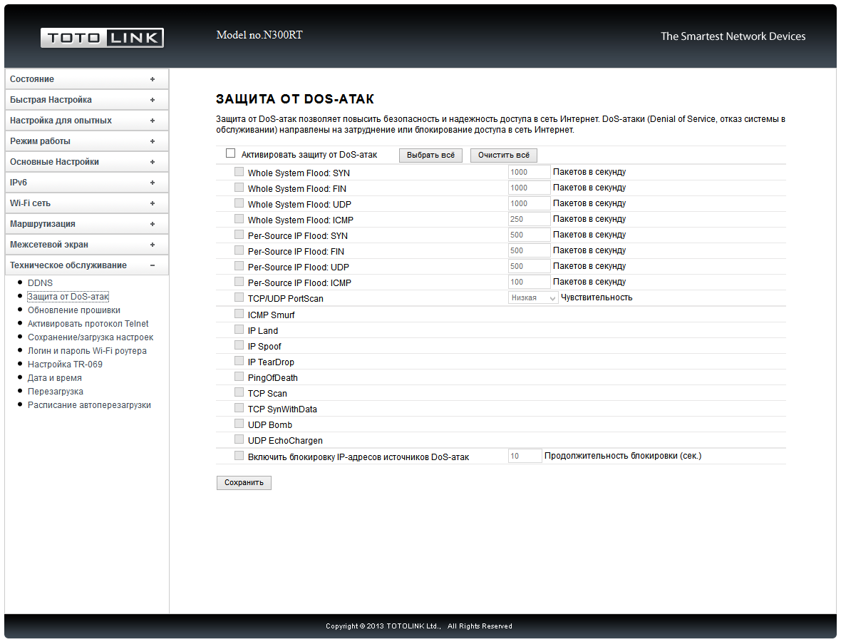 В роутере предусмотрена защита от атак DoS, которая по умолчанию выключена. Кроме того, присутствует межсетевой экран с привычными возможностями: фильтры IP и MAC используются для блокировки доступа в интернет клиентам внутренней сети по их адресам, фильтр по номерам портов блокирует удаленные сервисы сразу для всех клиентов сети, фильтр по URL позволяет заблокировать сайты по их именам.